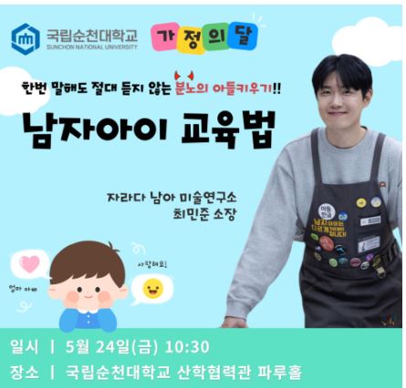 5월 24일(금) 오전 10시 30분, 국립순천대학교 산학협력관 파루홀(1층) 에서 <남자아이 교육법> 강연이 있습니다. 아래 빨간색 이미지를 누르시면 순천대학교 강연 참여방법과 참여대상 등 다양한 정보를 확인하실 수 있으십니다.